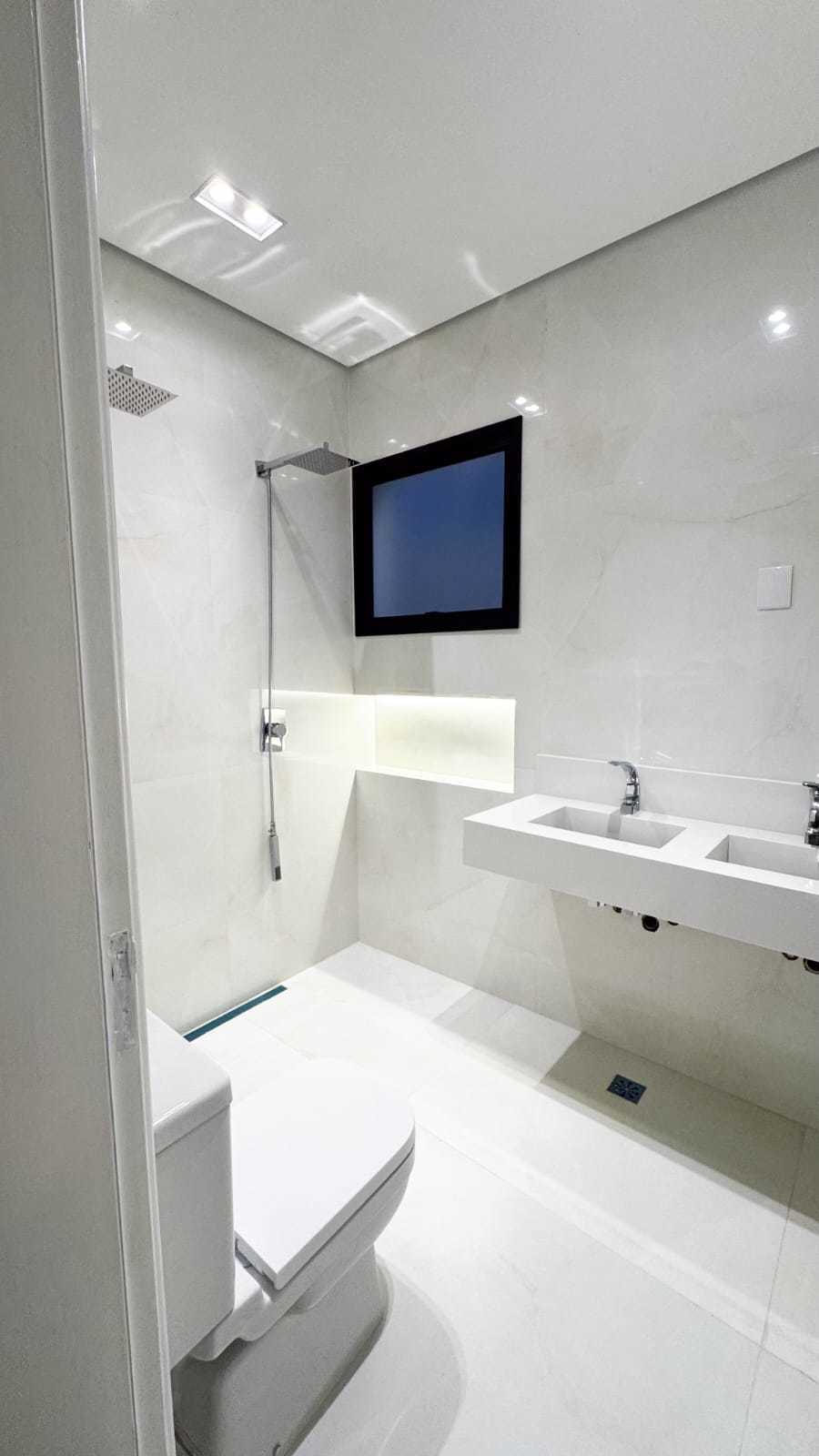 Suíte máster com armários planejados, duas cubas e dois chuveiros